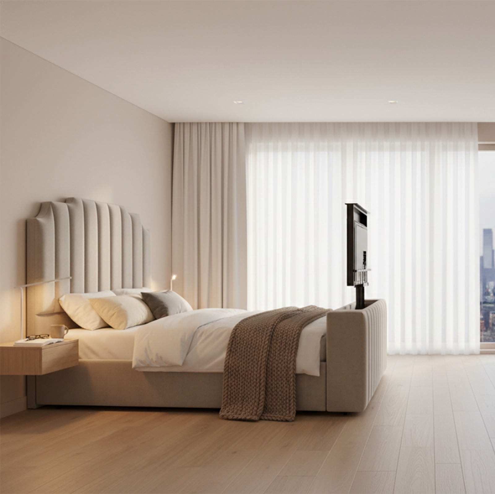 Motorized TV Lift: Effortlessly raise or lower your TV with a remote control; the screen hides completely within the footboard when not in use.