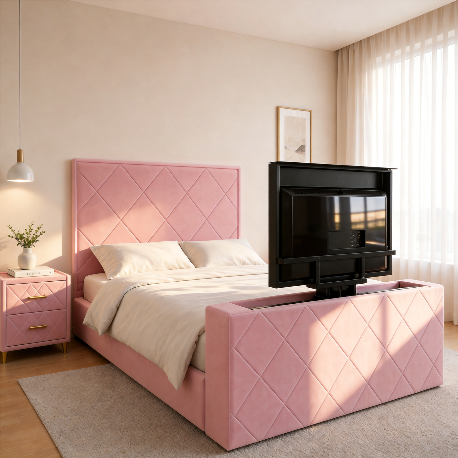 A luxurious, modern bed that blends comfort with technology, featuring a hidden motorized TV lift at the footboard for an ultimate viewing experience and a clutter-free room.